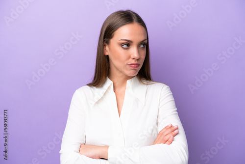 Young caucasian woman isolated on purple background keeping the arms crossed