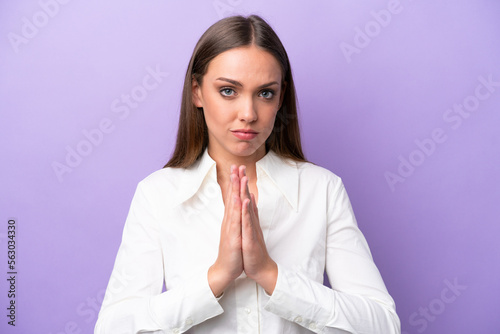 Young caucasian woman isolated on purple background keeps palm together. Person asks for something