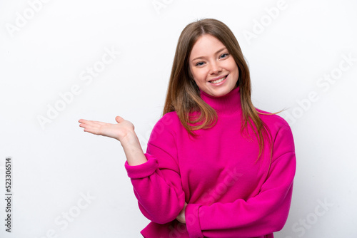 Young caucasian woman isolated on white background holding copyspace imaginary on the palm to insert an ad