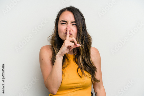 Young caucasian woman isolated on white background keeping a secret or asking for silence.