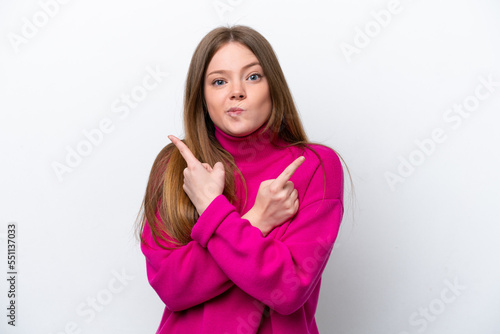 Young caucasian woman isolated on white background pointing to the laterals having doubts