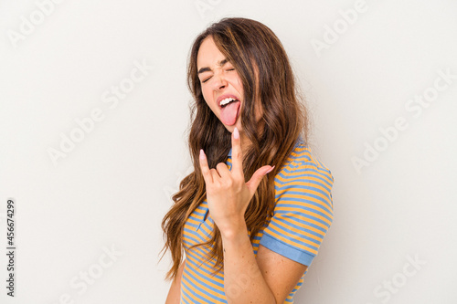 Young caucasian woman isolated on white background showing rock gesture with fingers
