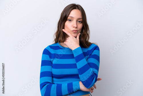 Young caucasian woman isolated on white background thinking