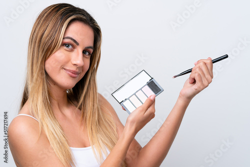 girl, woman, people, person, female, woman, lady, attractive, beauty, pretty, beautiful, youth, young, adult, blond, hair, 1, portrait, coiffure, background, isolated, white, blank, constructed, up, make-up, face, make-up, gloss, applying, skin, fashion, cosmetic, model, cosmetic, care, glamour, professional, brush