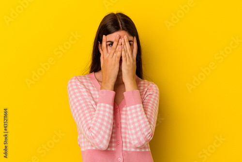 Young caucasian woman isolated on yellow background blink at the camera through fingers, embarrassed covering face.