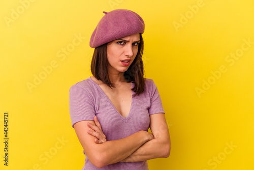 Young caucasian woman isolated on yellow background suspicious, uncertain, examining you.