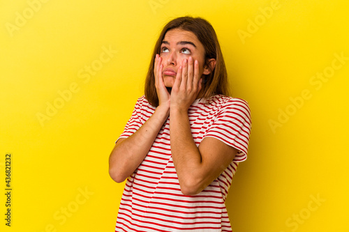 Young caucasian woman isolated on yellow background whining and crying disconsolately.