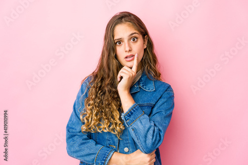 person, woman, attractive, girl, face, female, isolated, portrait, pink, young, background, caucasian, student, teenage, goggles, confuse, doubt, uncertain, disappointed, question, pensive, touching, chin, finger, thoughtful