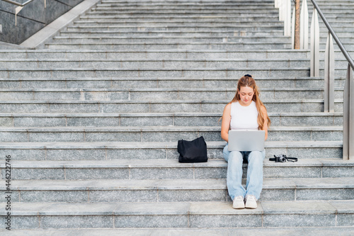 young, caucasian, woman, sitting, staircase, using, computer, trading, online, shopping, watching, streaming, video, advertising, copy space, freelancer, business, technology, laptop, communication, cyberspace, workspace, banner, working, banking, e-business, reading, booking, education, browsing, studying, social, network, lifestyle, authentic