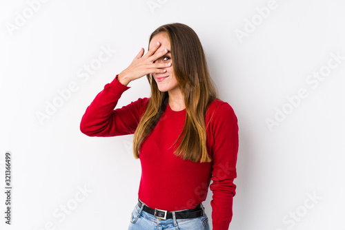 Young caucasian woman posing isolated blink at the camera through fingers, embarrassed covering face.