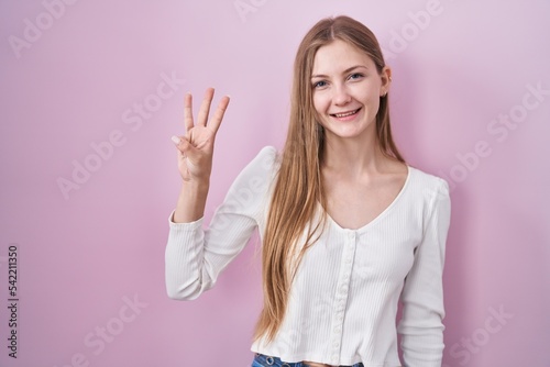 Young caucasian woman standing over pink background showing and pointing up with fingers number three while smiling confident and happy.