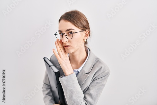Young caucasian woman wearing business clothes and glasses hand on mouth telling secret rumor, whispering malicious talk conversation