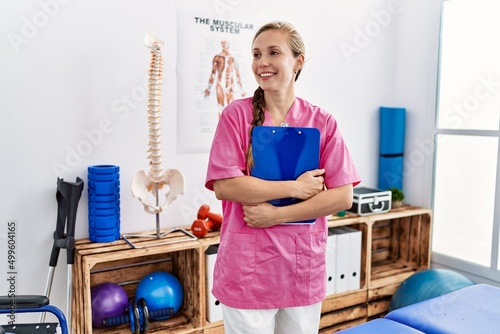 Young caucasian woman wearing physiotherapist uniform holding checklist standing at physiotherapy clinic