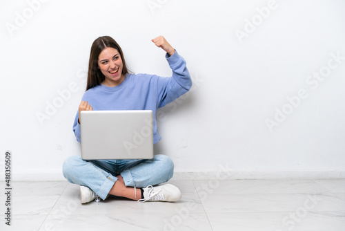 Young caucasian woman with laptop sitting on the floor isolated on white background celebrating a victory