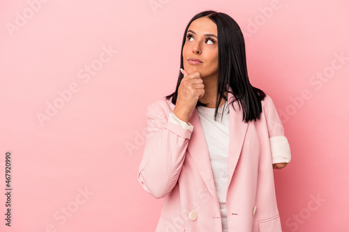 Young caucasian woman with one arm isolated on pink background looking sideways with doubtful and skeptical expression.