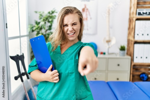 Young caucasian woman working at pain recovery clinic pointing displeased and frustrated to the camera, angry and furious with you