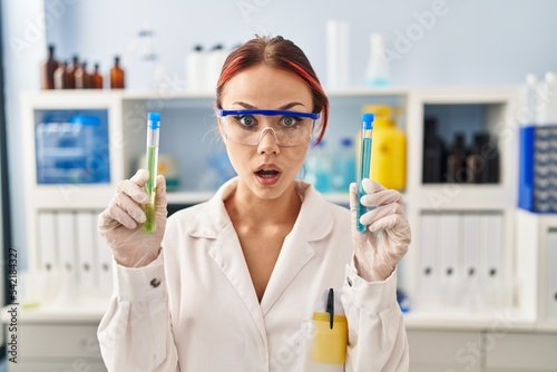 Young caucasian woman working at scientist laboratory holding samples afraid and shocked with surprise and amazed expression, fear and excited face.