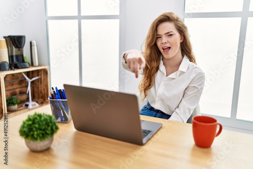 Young caucasian woman working at the office using computer laptop pointing displeased and frustrated to the camera, angry and furious with you