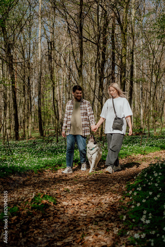 young cheerful couple playing with their cute mixed breed rescue dog outdoors in the forest