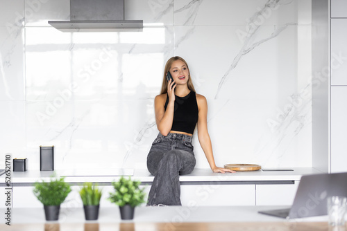 woman, female, casual attire, caucasian, modern, adult, kitchen, talking, laptop, home, attractive, phone, domestic, beautiful, girl, young, smiling, happy, mobile, call, lifestyle, flat, sunny, education, cheerful, indoor, posing, technology, person, apartment