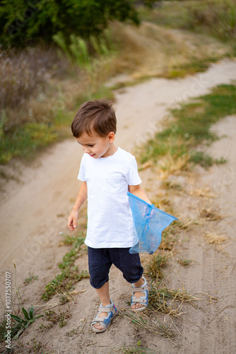 children, boy, dirt, path, nature, exploration, sunlight, blue, bag, outdoors, walking, adventure, sand, grass, play, summer, casual attire, curiosity, toddler, environment, rural, journey, leisure, landscape, happiness, innocence, freedom, travel, young, wear, playful, fun, wildflower, terrain, active, brown, hair, footwear, surrounding, scenic