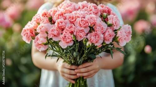 Young Child Holding a Beautiful Bouquet of Pink Carnations Surrounded by a Field of Blossoming Flowers in Soft Natural Light
