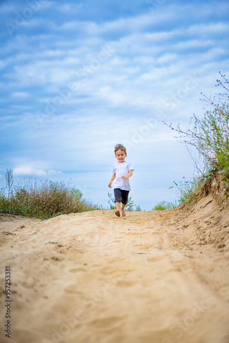 Young child joyfully walks along a sandy path on a sunny day. A young child walks barefoot along a sandy path surrounded by greenery and under a blue sky