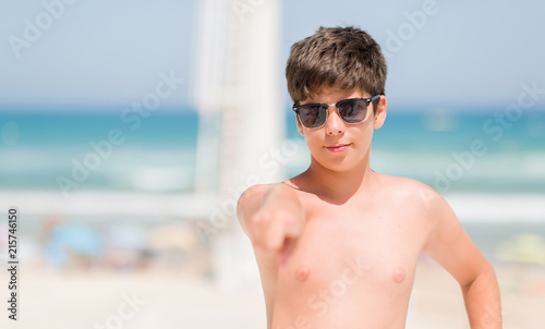 Young child on holidays by the beach pointing with finger to the camera and to you, hand sign, positive and confident gesture from the front