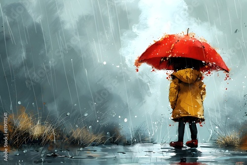 rain, umbrella, puddle, weather, season, children, standing, wet, storm, autumn, nature, landscape, environment, overcast, cold, cloudburst, precipitation, cover, shelter, protection, pathway, pavement, mud, waterproof, moody, gloomy, street, sidewalk, lonely, melancholy, pensive, thoughtful, solitary, alone, contemplative, tranquil, peaceful, serene, rainy day, rainy season, rain shower, rainstorm, childhood, kid playing, youth