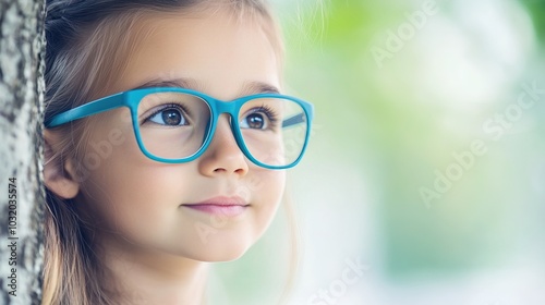 Young child wearing blue glasses focusing on distant tree outside window, symbolizing myopia prevention and importance of outdoor activities.