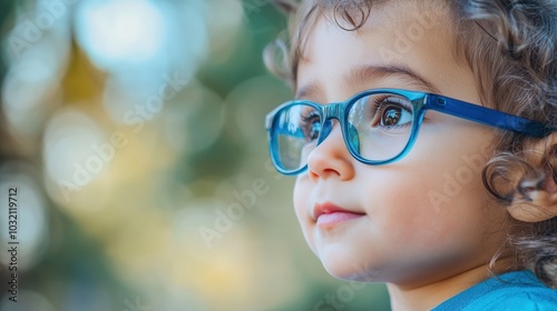 Young child wearing blue glasses focusing on distant tree outside window, symbolizing myopia prevention and importance of outdoor activities.