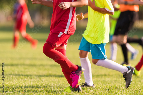 Young children players football match on soccer field
