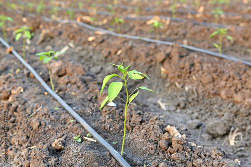 Young chili plant in the farm with Self-compensating dripper irrigation used in agriculture.