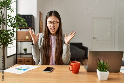 Young chinese business worker wearing business style sitting on desk at office celebrating mad and crazy for success with arms raised and closed eyes screaming excited. winner concept