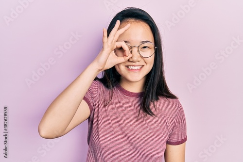 Young chinese girl wearing casual clothes and glasses doing ok gesture with hand smiling, eye looking through fingers with happy face.