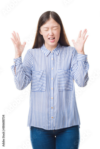 Young Chinese woman over isolated background celebrating mad and crazy for success with arms raised and closed eyes screaming excited. Winner concept