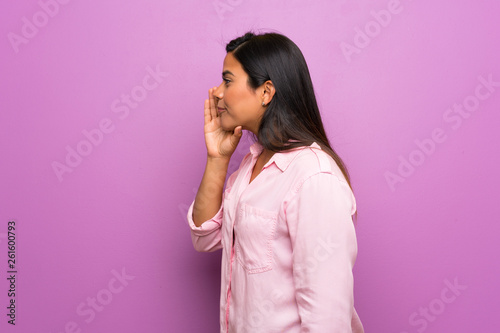 Young Colombian girl over purple wall shouting with mouth wide open to the lateral