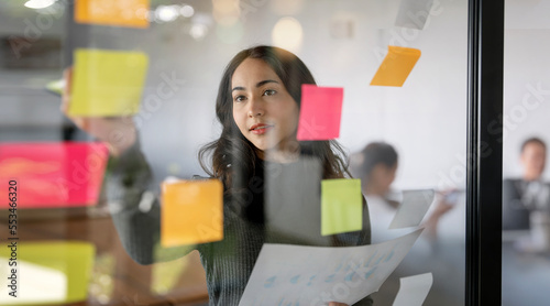 Young confident Businesswoman planning with adhesive notes in creative office.
