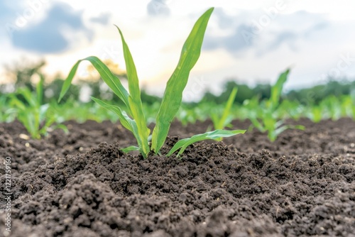 Young Corn Plants Growing in Rich Soil Agricultural Field Spring Growth