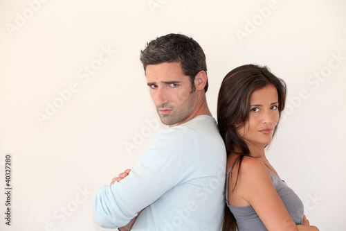 couple, man, woman, girl, boy, lover, trendy, model, casual attire, isolated, wall, white background, copy space, message, expression, face, attitude, mad, madness, anger, angry, back to back, standing, attractive, pretty, photogenic, cute, good-looking, lifestyle, feeling, human relationships, studio, 30s, 30s, caucasian, brunette, dark-haired, young adult, boyfriend, girlfriend, modern, stylish