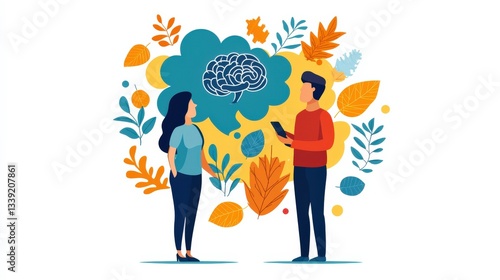 couple, woman, man, communication, brainstorming, thinking, creativity, dialogue, idea, human relationships, nature, colourful, illustration, leaf, emotion, design, digital, art, graphic, concept, discussion, expression, teamwork, planning, conversation, innovation, human, gesture, influence, motivation, inspiration, modern, connection, sharpened, social, imagination, engaging, health, intervention, app, manage, mental, wellness, bright, environment, space, copy, health care, medicine