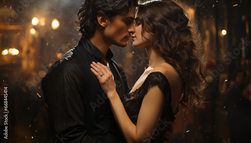 Young couple embracing, smiling, celebrating love in a nightclub generated by AI
