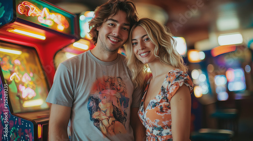 couple, date, arcade, night, vibrant, young, enjoying, happiness, human relationships, fun, leisure, entertainment, game, machine, light, smiling, togetherness, dating, youth, casual attire, fashion, stylish, love, bonding, interaction, attraction, smile, joy, bright, coloured, neon, glow, recreational, indoor, happy, together, man, woman, romantic, amusement, playful, modern, lively, energy