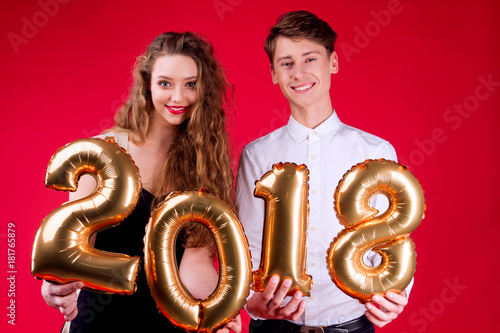 Young couple friends, female woman and male man holding gold balloons numbers 2018 as symbol of New Year on red background