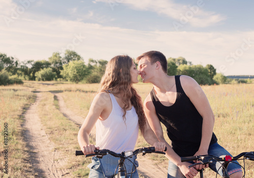 young couple having a bike ride in nature