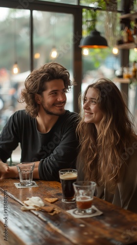 pretzel, snack, pub, beer, drinking, date, counter, alcohol, hipster, enjoyment, bar, togetherness, conversation, human relationships, romance, trendy, beverage, window, couple, relaxation, glasses, drink, casual attire, indoor, leisure, interior, cheerful, love, smiling, fun, table, wood, man, light, lifestyle, happy, woman, young, hot drink, friends, cafes, 2, talking, smile, lunch