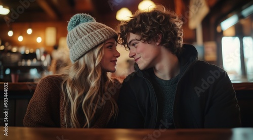 Young Couple in Knitted Hats Gazing at Each Other in Cozy Coffee Shop