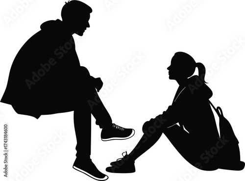 silhouette, couple, young, people, man, woman, talking, conversation, sitting, white background, black-and-white, minimalist, modern, human relationships, friendship, youth, casual attire, relaxed, together, connection, communication, simple, graphic, design element, pair, two people, backpack