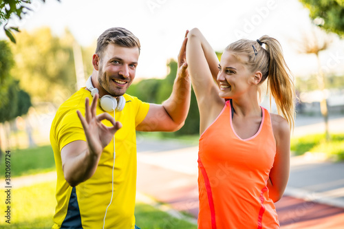 Young couple is exercising outdoor. They are and stretching and warming up for jogging.