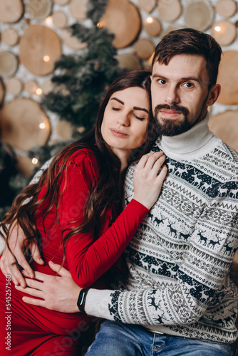 Young couple near the Christmas tree. A pregnant woman and a man are waiting for a miracle